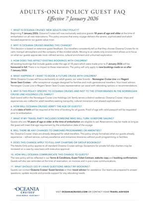 At Oceania Cruises, we believe that true luxury is found in tranquility, connection, and the freedom to explore the world at your own pace. Beginning January 7, 2026, we will transition to an adults-only experience for all new reservations, welcoming guests 18 years of age and older across future sailings. All existing reservations that include travelers under 18 made prior to this date will continue to be fully honored, ensuring a considerate and seamless transition for our guests.