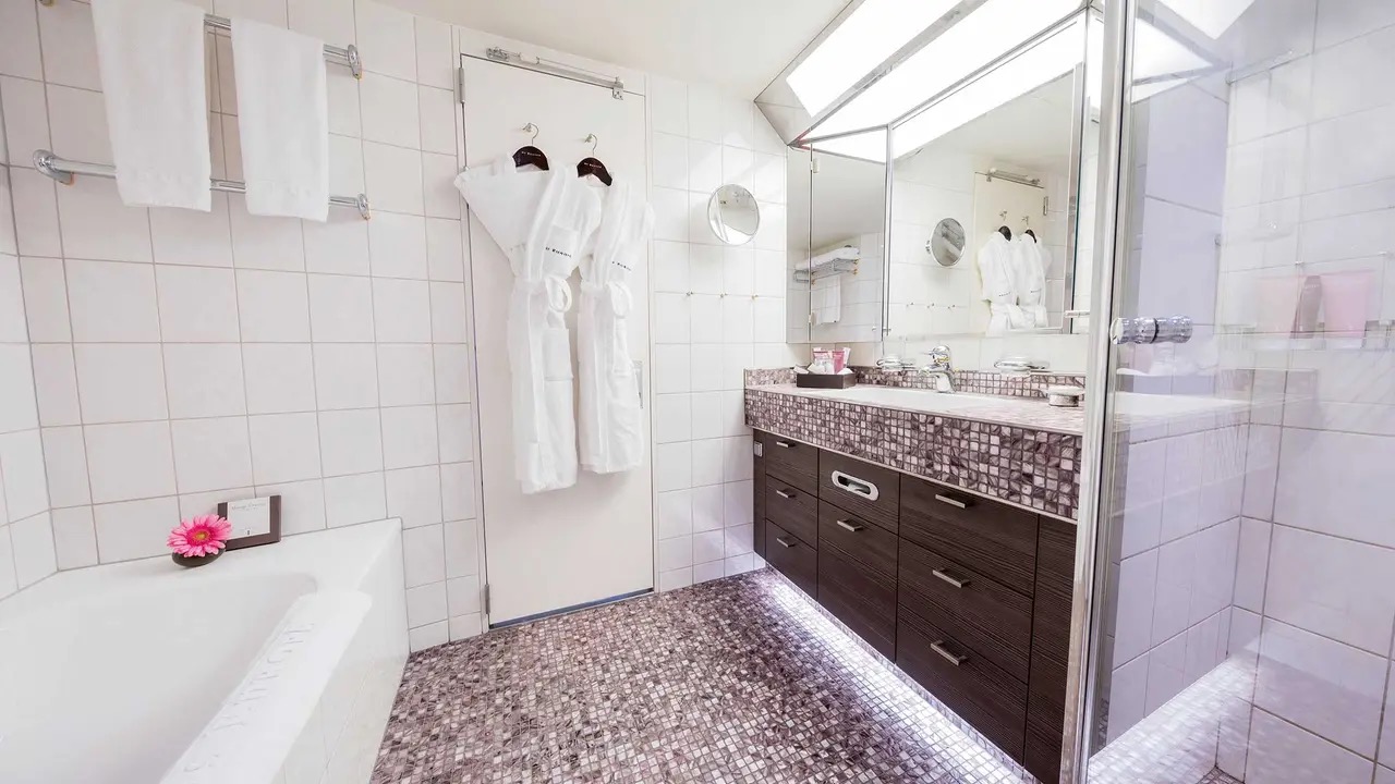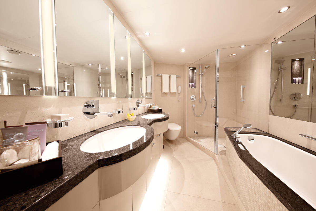 - Bathroom with underfloor heating, two washbasins, a whirlpool bath, seperate shower, a private sauna