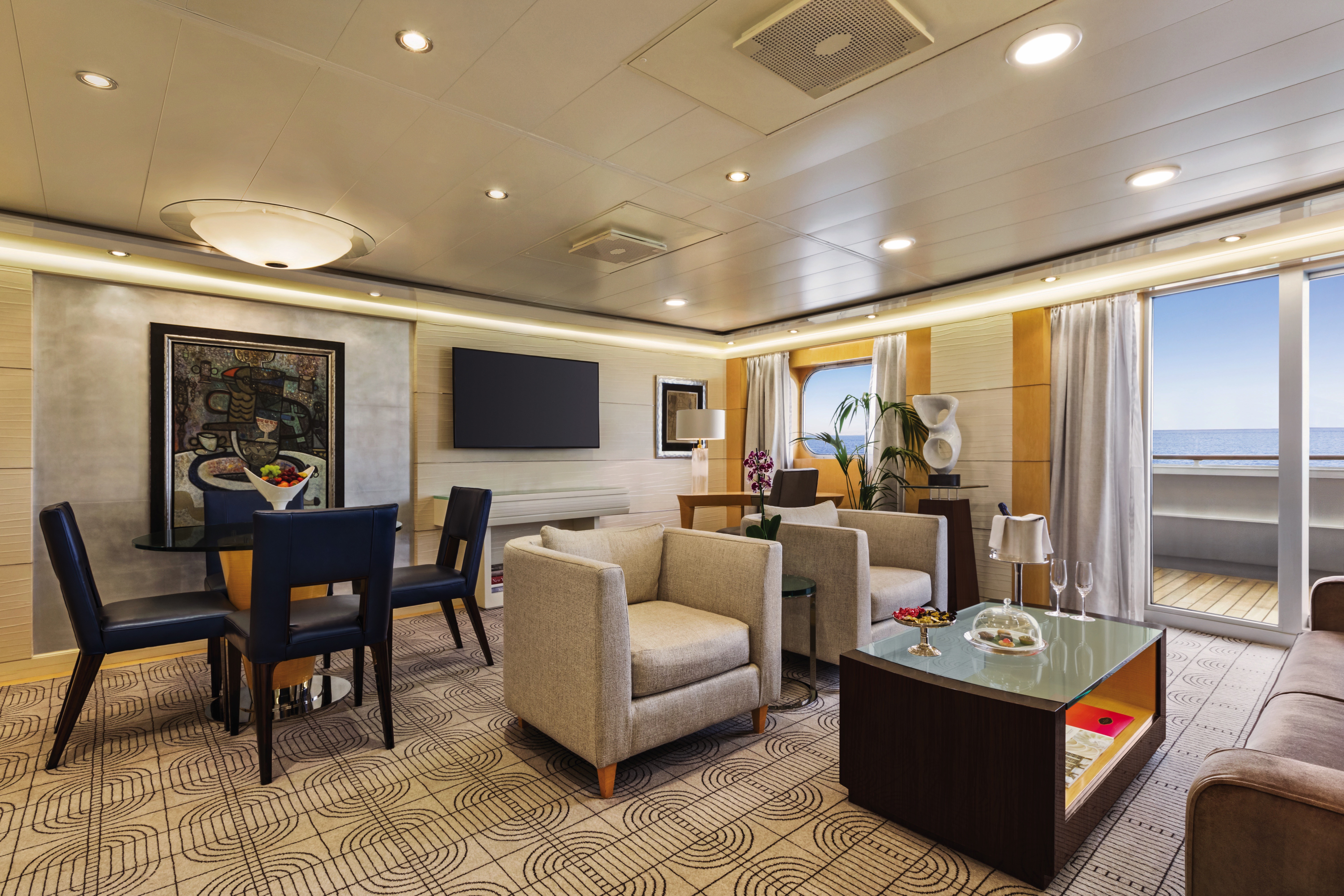 Akin to a dramatic coastal villa, the Owner’s Suites exude a sophisticated and luxurious personality. At more than 2,000 square feet, each features a living room, dining room, master bedroom and two bathrooms. These suites are adorned with designer furnishings and exquisite appointments, creating a blissful enclave at sea. There are separate terraces for the living areas and bedroom and expanses of floor-to-ceiling windows provide captivating vistas and with the stunning backdrop of the sea all around. All of our suites include exclusive 24-hour Butler service and are uncommonly spacious, further adding to the unparalleled suite experience.