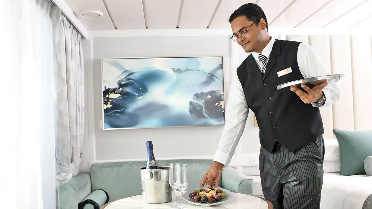 After a day of enriching shore excursions ashore or various activities on board, you may dine in the privacy of your suite or stateroom with our compliments. An extensive Room Service menu is available around the clock. Enjoy breakfast, lunch or dinner on your private veranda, as you take in spectacular seascapes.
