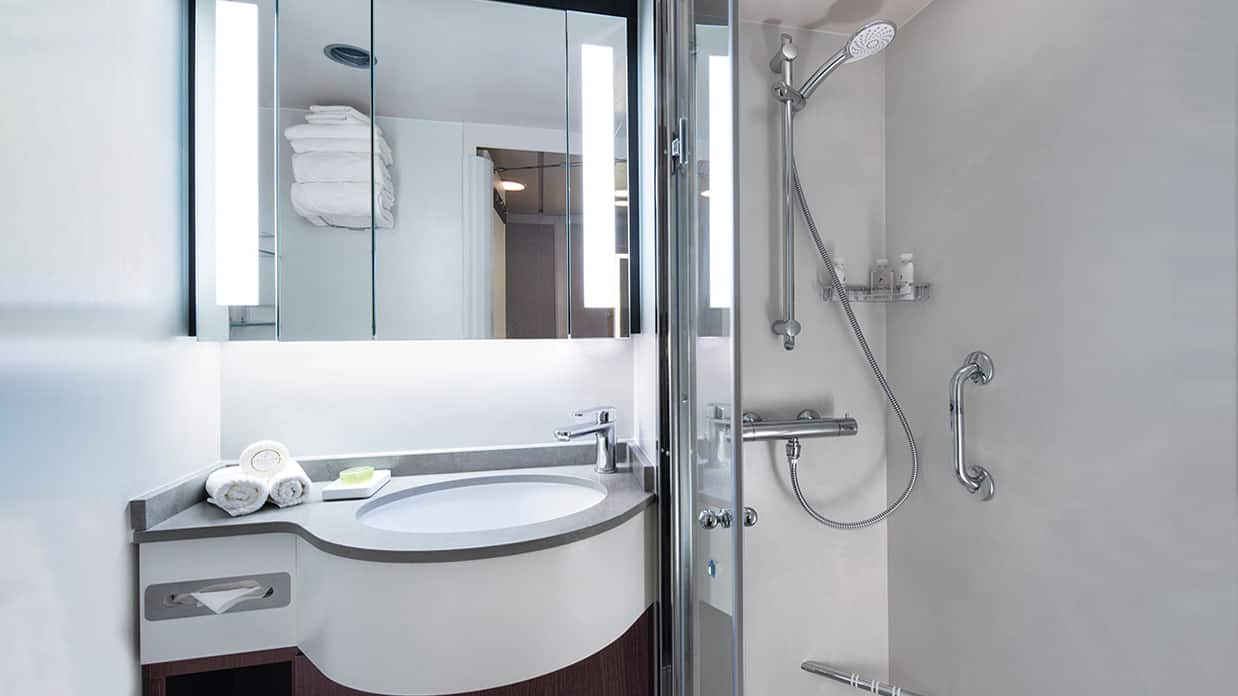 These charming 143-square-foot staterooms are the perfect retreat for the solo traveler. Amply spacious and centrally located on Deck 6, each is equipped with a sublimely plush Tranquility Bed, refrigerated mini-bar, writing desk and abundant storage space.