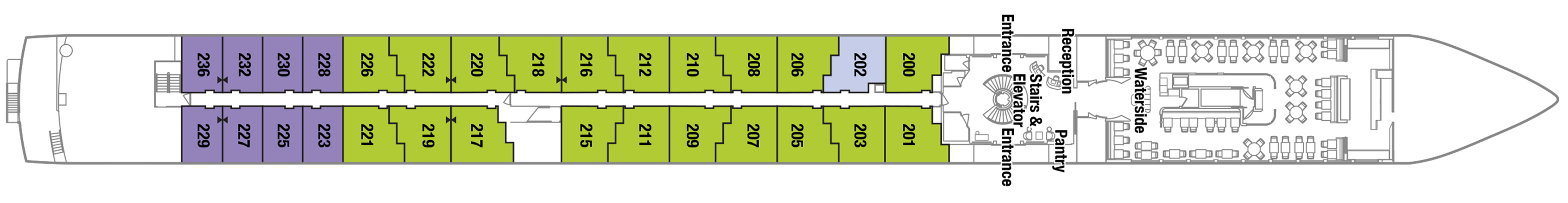 At nearly 18 square metres it’s a little smaller, but you’ll still enjoy great comfort in a Symphony Suite. Luxuriate in bed covers made of the finest cotton and start your day with a tea or coffee in bed with a view outdoors. The rain shower in the bathroom will revitalise you with energy for the day. A small desk offers you the opportunity to make some notes – after all, travelling with the Ravel is rich in experiences.
