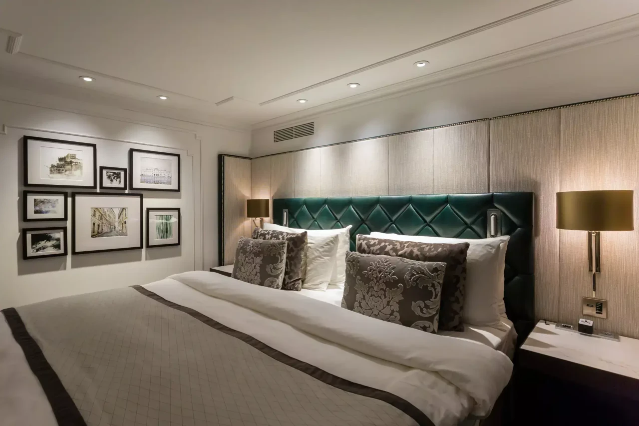 A dream that spans 883 square feet / 82 square meters – the Mozart Suite combines with the Riverside Suite to form the Owner’s Suite. Two bedrooms, two bathrooms, and a stylish living room. Sit by the fireplace and read a book. Dine privately with your family. Work a bit at the desk before you go out and play. This is a space that lets you go from casual to haute couture with little effort. Watch television as we wash, iron, and make your clothes worthy of each special night you’ll enjoy.