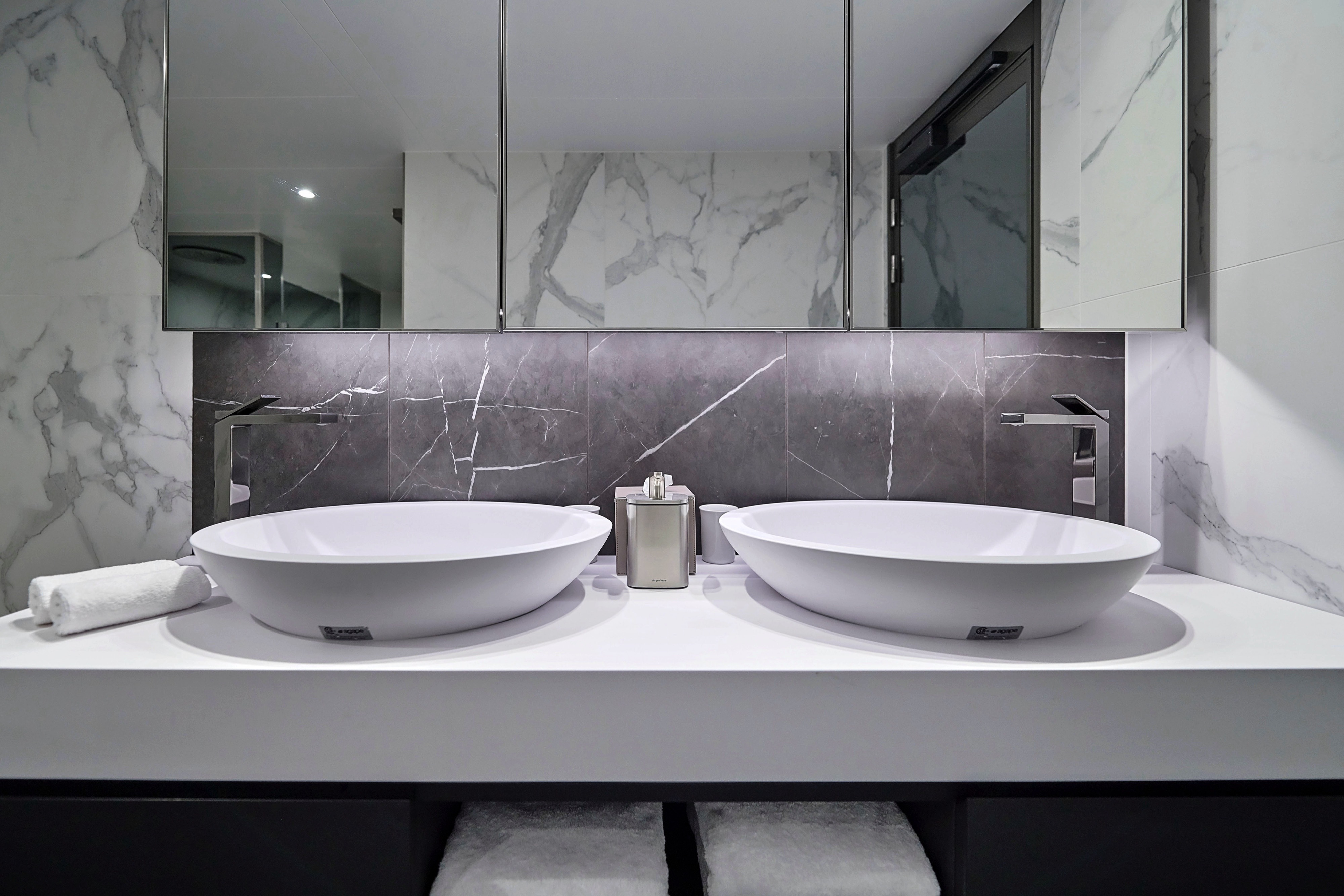 - An expansive bathroom with a rectangular spa bath on Scenic Eclipse I and circular spa bath on Scenic Eclipse II