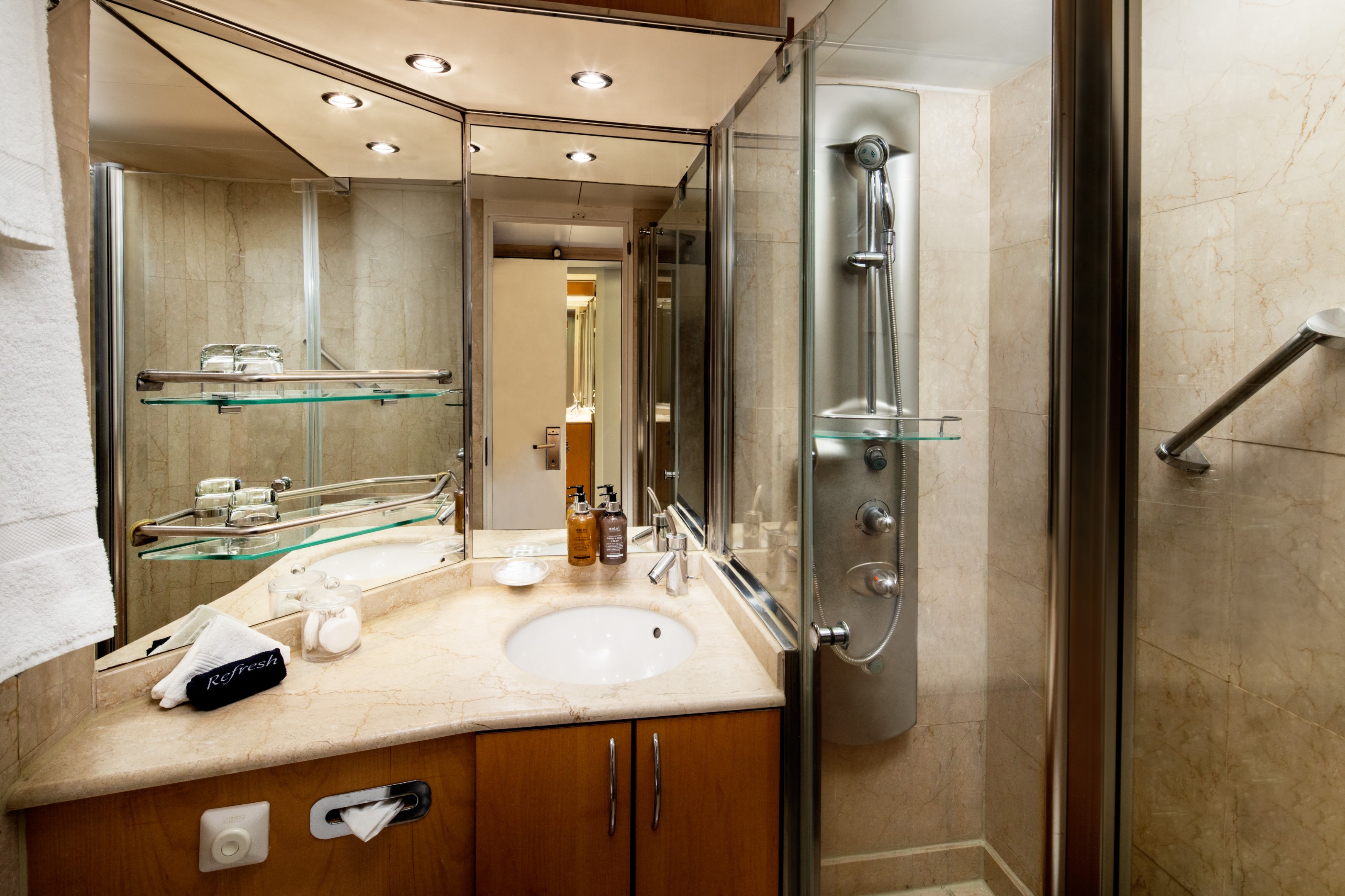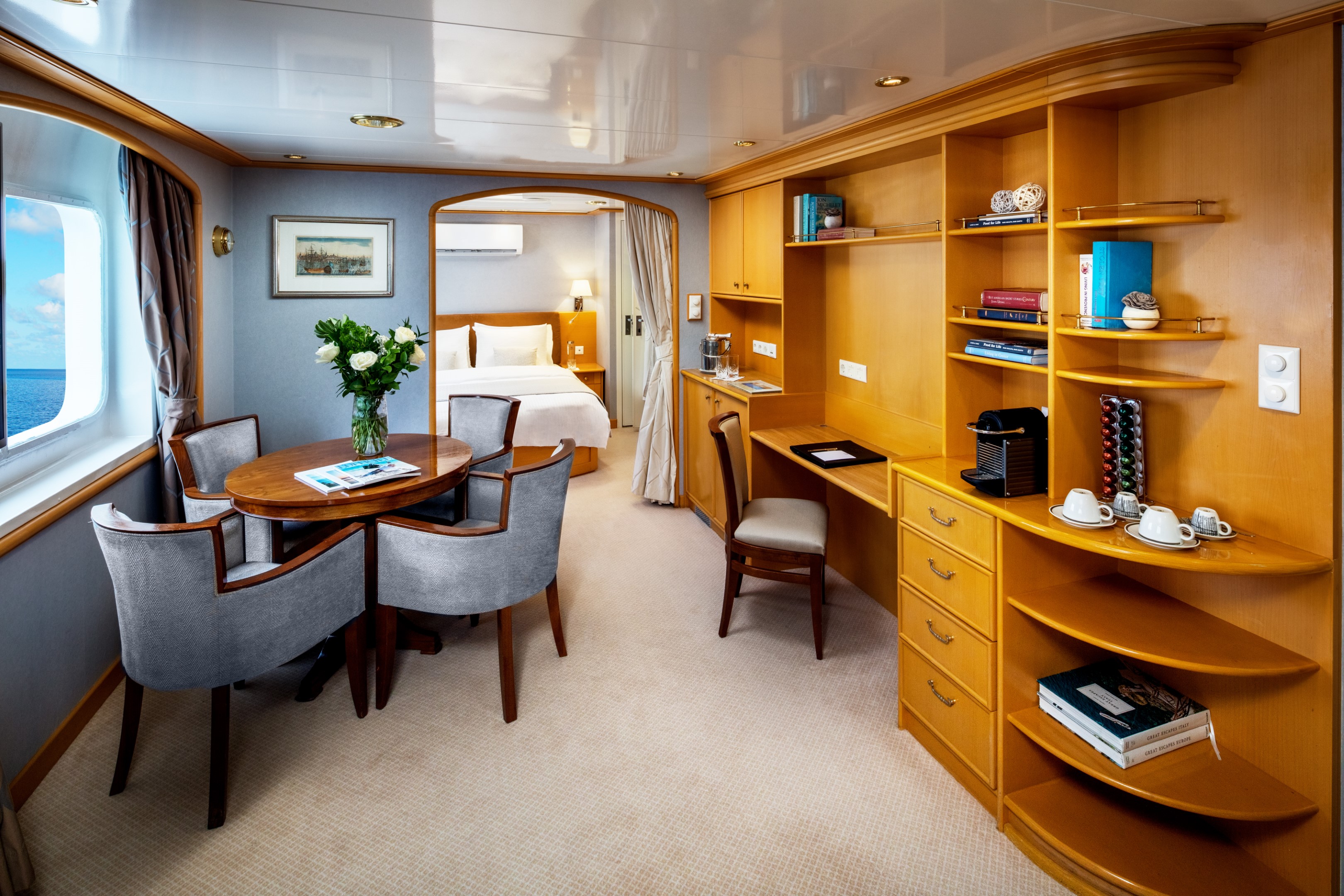 Enjoy 375 sq. ft. / 34.8 sq. meters of living space with ocean views from a total of 3 picture windows. Partitioned living and dining areas with ½ guest bath and closet. Separate and private en-suite master bedroom with permanent queen bed and closet. Marble-lined bathroom with multi-jet shower and soaking tub. Built-in dresser with writing desk. The Admiral Suite is Suite 400 on both yachts and is near the Library.