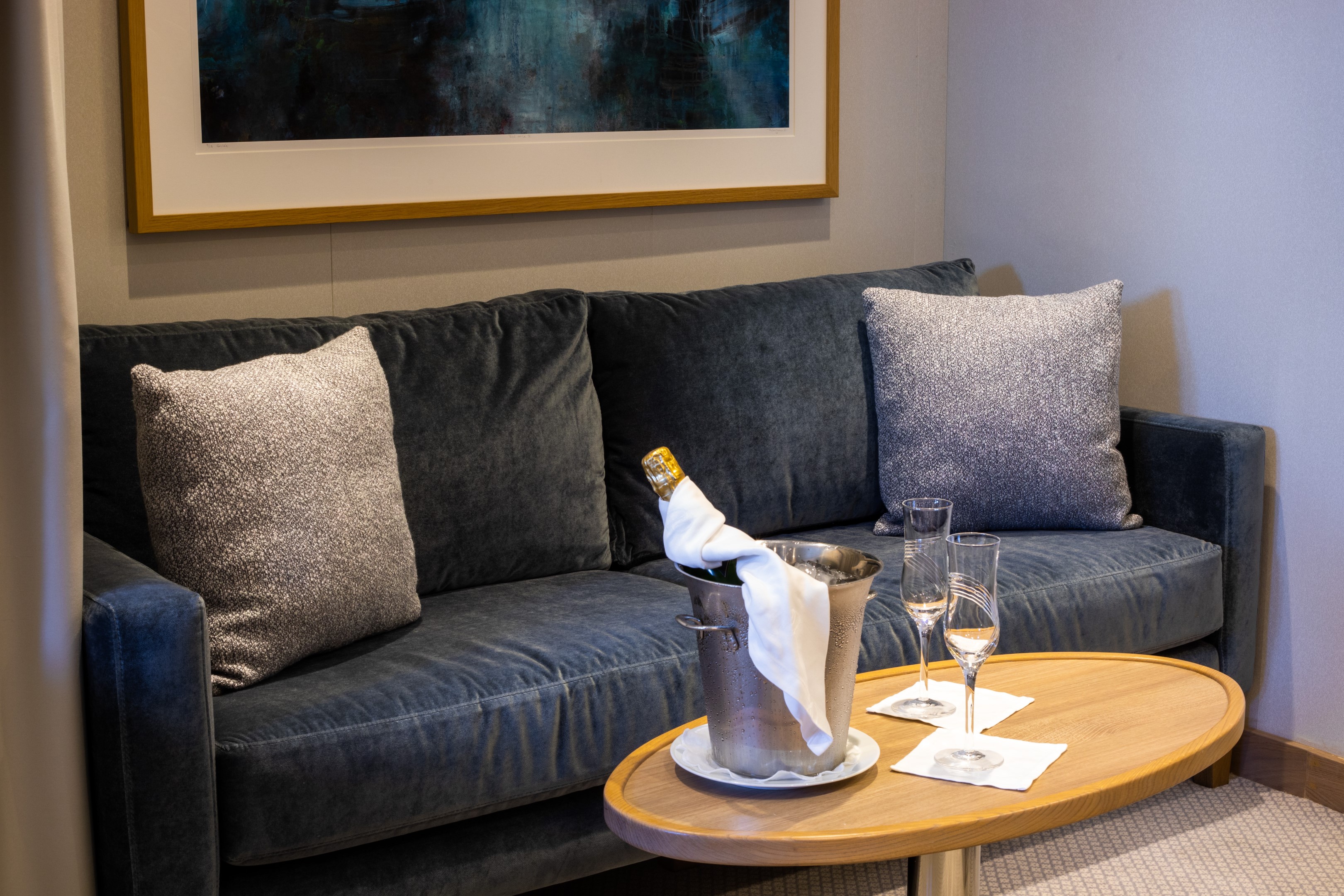 Yacht Club Deck 3 & 4 staterooms average 195 sq.ft./18.12 sq. meters. These picture window ocean view staterooms include a marble-lined bathroom in select staterooms with a multi-jet shower and a well-appointed open living area with sofa, chair, cocktail table, and built-in dresser with writing desk. Most staterooms offer a choice of 2 twin beds or 1 queen bed. Please contact the reservations team to confirm your choice. Deck 4 staterooms enjoy close proximity to the SeaDream Spa, Fitness Centre, and Library. Deck 3 is the perfect location for guests who desire to be just feet from the pool.