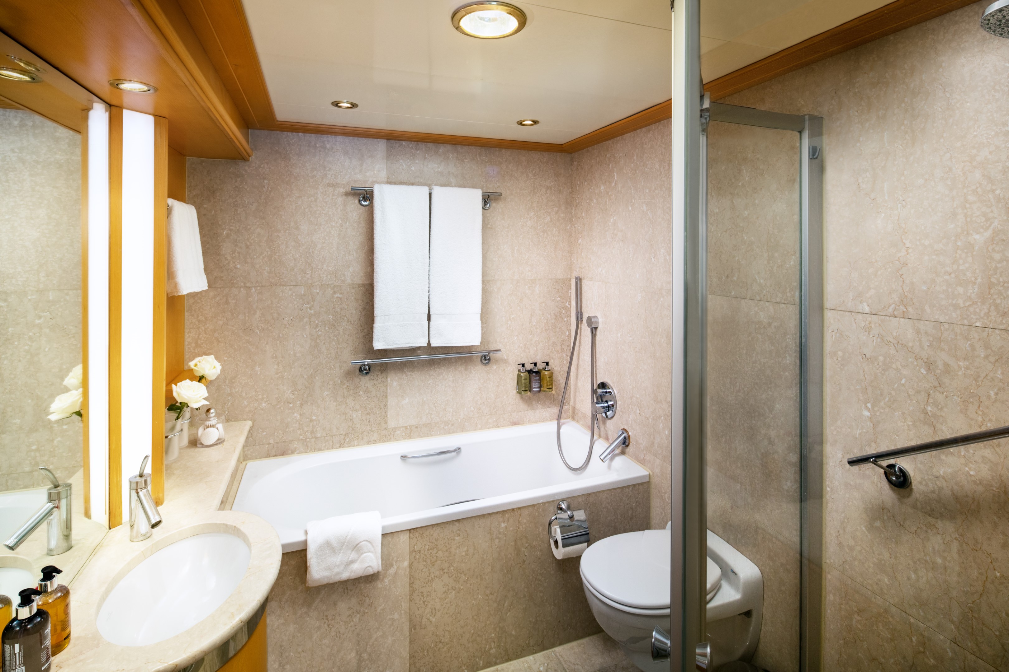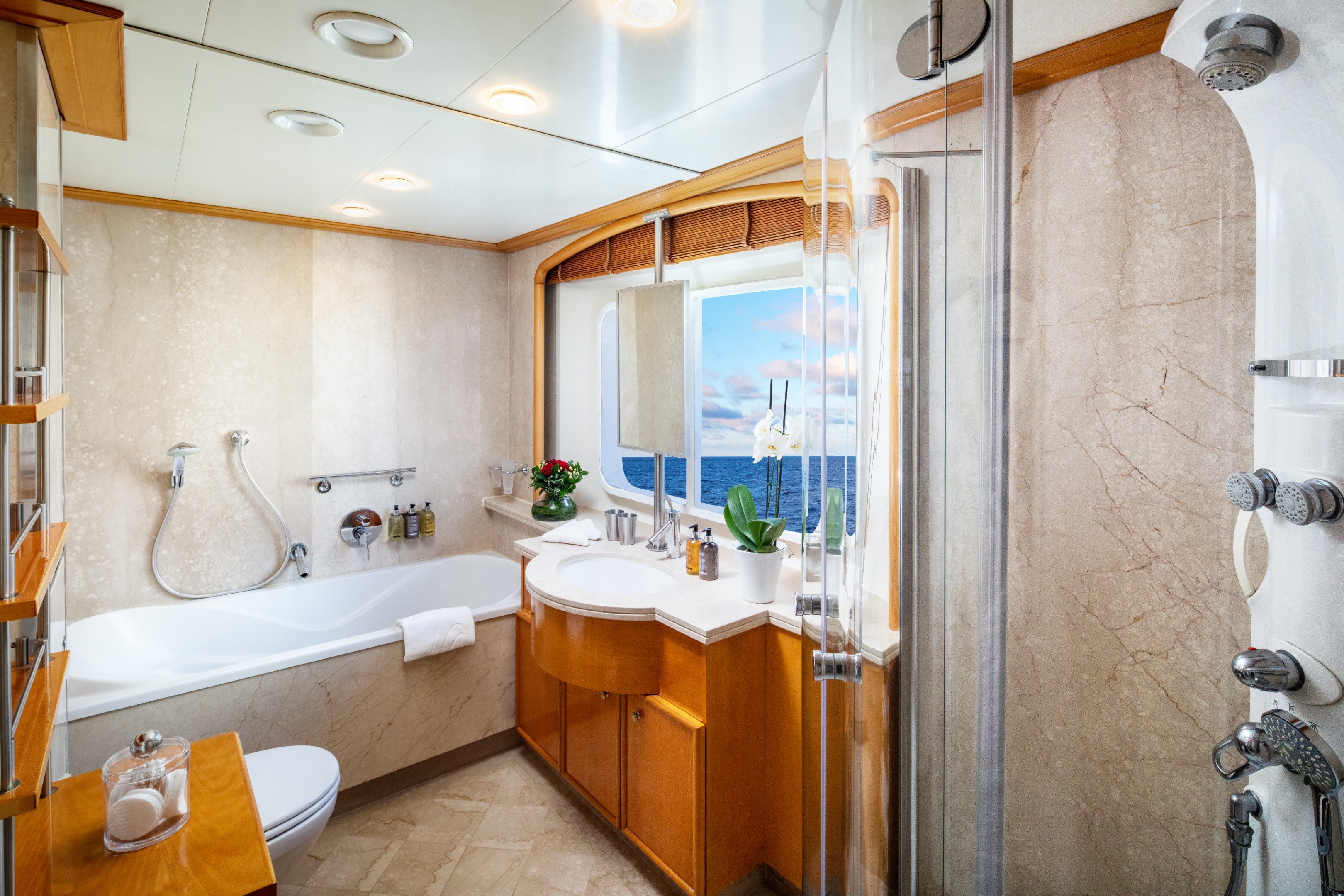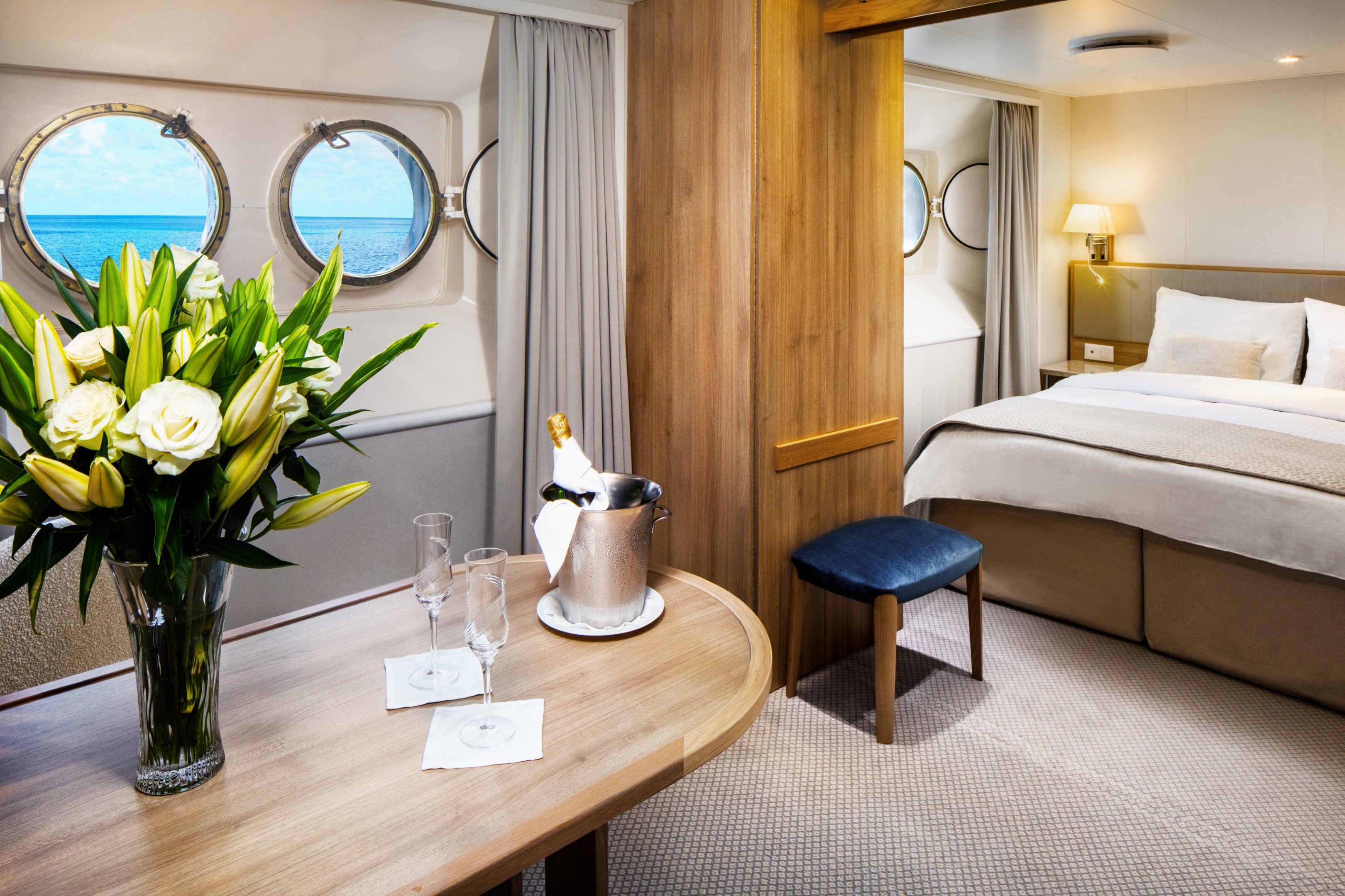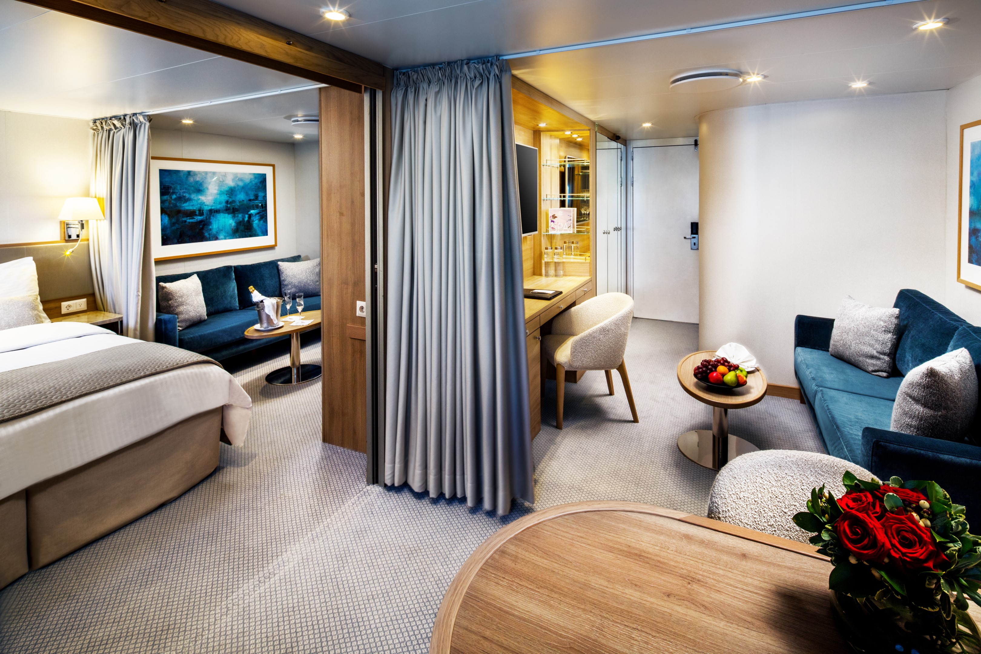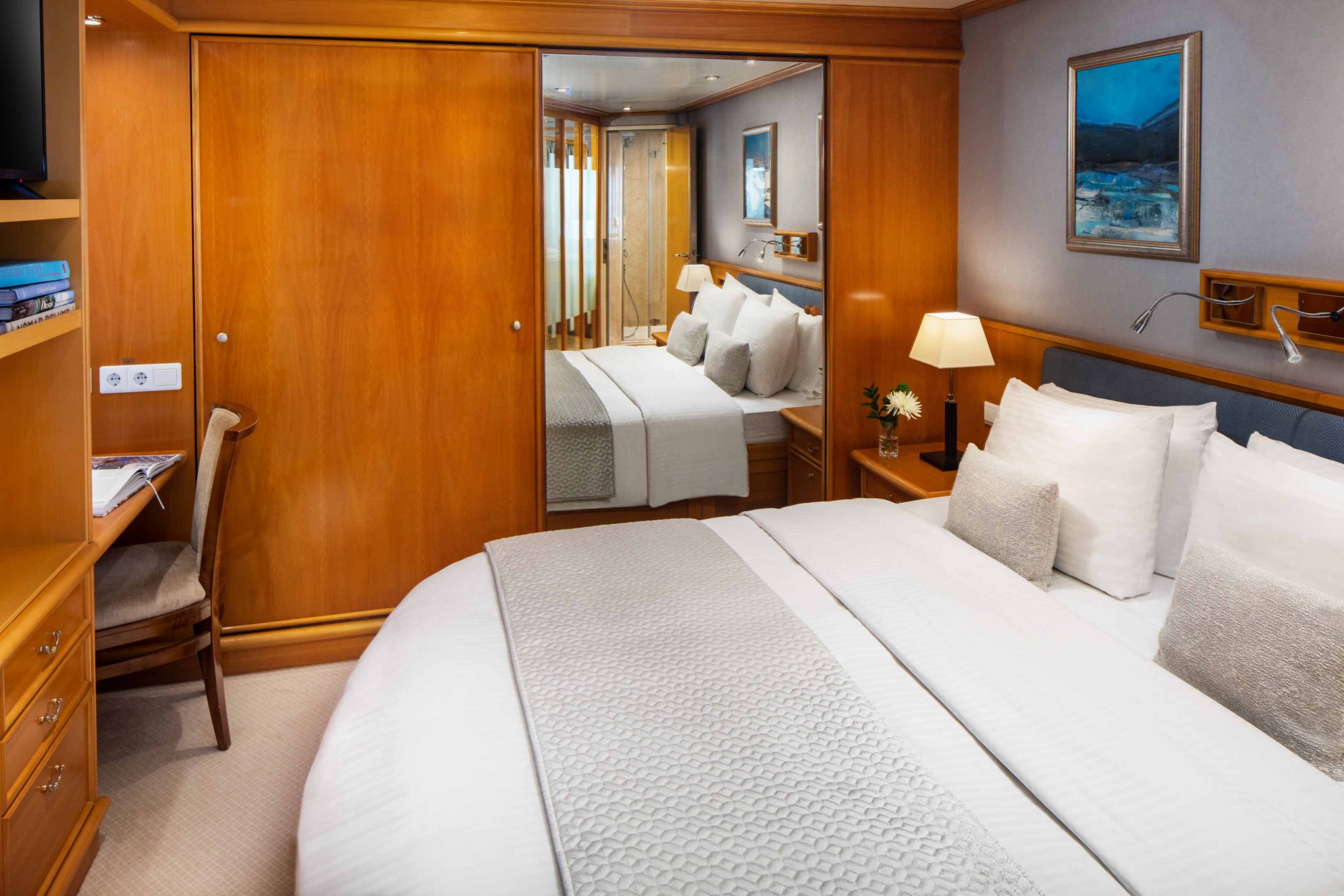 This premium suite (447 sq. ft. / 41.53 sq. meters) includes a thoughtfully appointed separate master bedroom with a permanent queen size bed and a flat-screen TV. The suite features a large master bathroom with a massage shower and a separate soaking tub with views of the sea. A spacious living area with a flat-screen TV, writing desk, and ½ guest bath. There is also a dining area suitable for hosting your friends and family. The Owner’s Suite is suite number 315 on both yachts, located mid-ship on Deck 3 – Close to the pool (aft, deck 3).