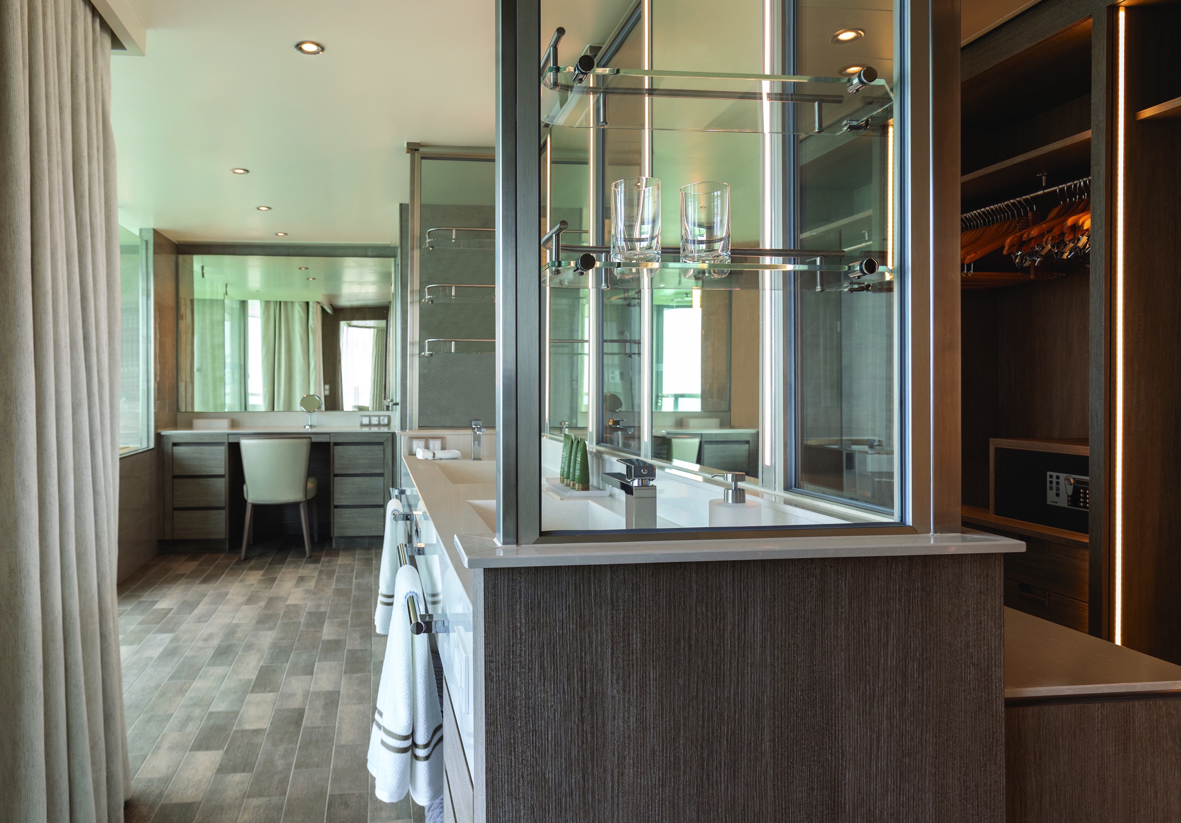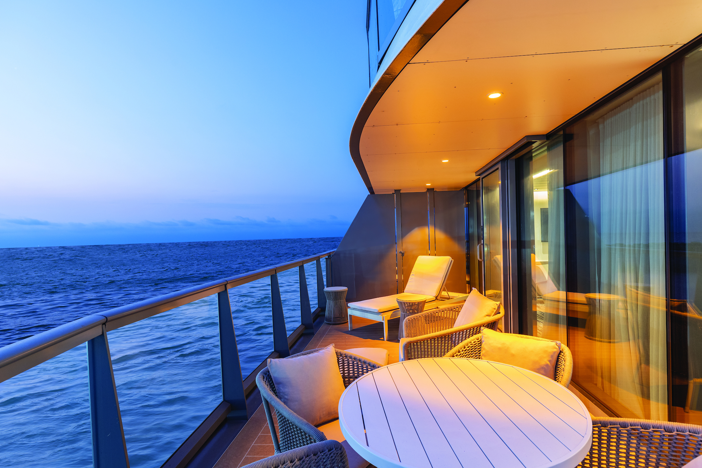 The Royal Suite really is fit for a king! Among our largest on offer, not only does this suite have a private, spacious veranda, but the privileged location at the back of the ship means that you’re sure to get the best views there are! Expect all your favorite comforts inside: a large ocean-view bathroom with whirlpool bath and walk-in shower, state-of-the-art entertainment system, and plush bedding ensure the best night’s sleep you’ve ever had.
