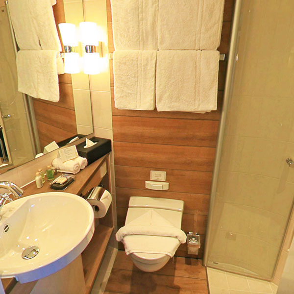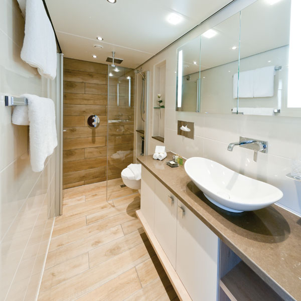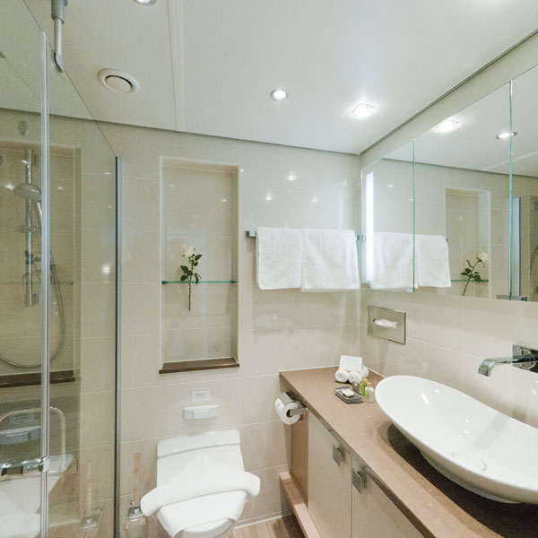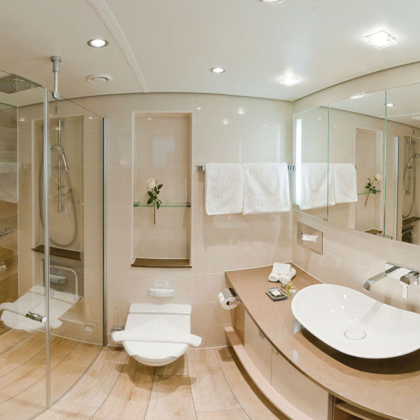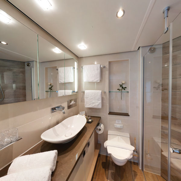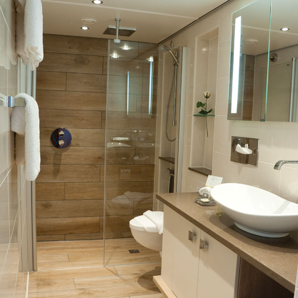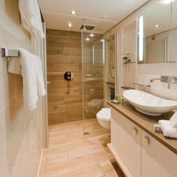 Molton Brown toiletries – a Tauck Exclusive, Terry-cloth bathrobes plus slippers, Full-size bathroom featuring enhanced lighting, additional storage and a hair dryer, Large shower featuring rainfall shower head (note: no bathtub)