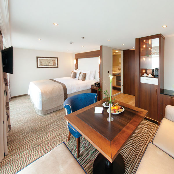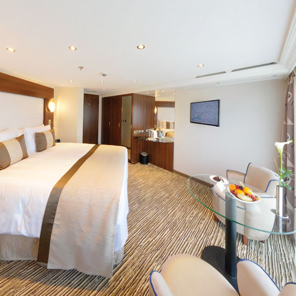 Two floor-to-ceiling French balconies, each 98 inches x 75 inches with one sliding door that opens, 32" LED TV, Safe, Minibar stocked with complimentary water and soft drinks, replenished daily, Coffee maker, Breakfast room service, Iron plus ironing board, 220v and 110v outlets in cabin and bathroom, Easy under-bed luggage storage, Telephone and individual climate control, Onboard wi-fi available, a shipboard credit (one per stateroom) is provided to be used onboard for spa services, gift shop purchases, etc