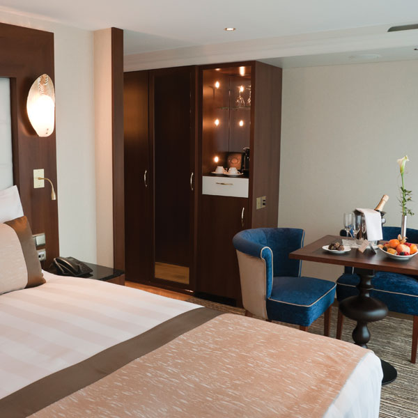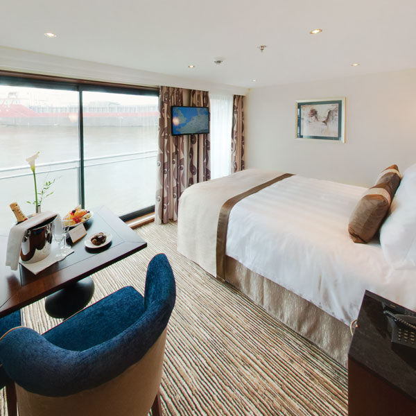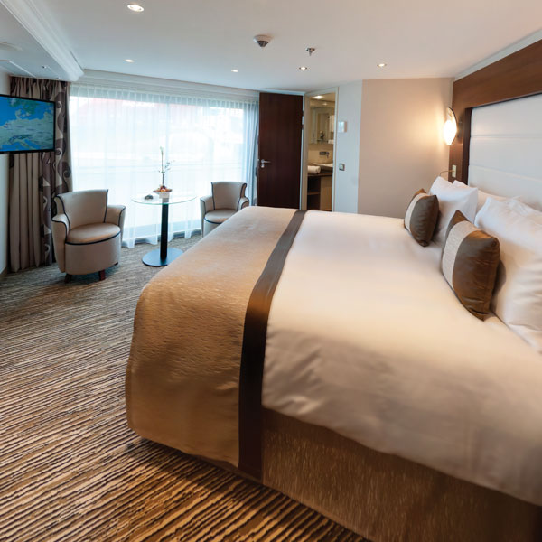 One floor-to-ceiling French balcony (98 inches x 75 inches) with one sliding door that opens, 32" LED TV, Safe, Minibar stocked with complimentary water and soft drinks, replenished daily, Elegantly designed 225 sq. ft. cabins on the Ruby Deck, 220v and 110v outlets in cabin and bathroom, Easy under-bed luggage storage, Telephone and individual climate control, Onboard wi-fi available
