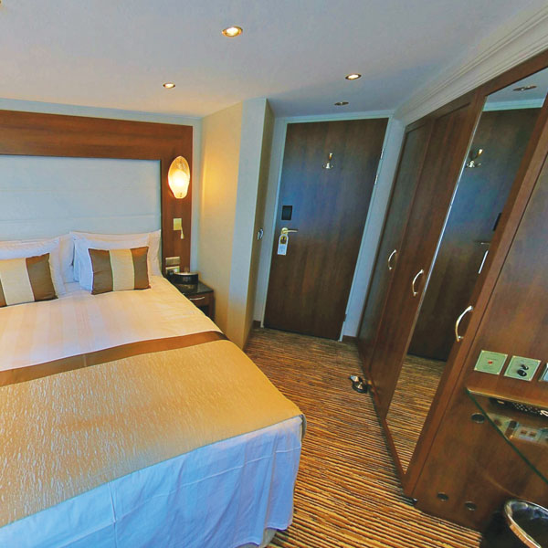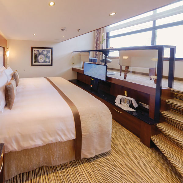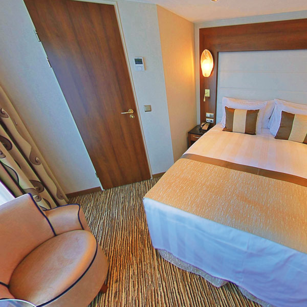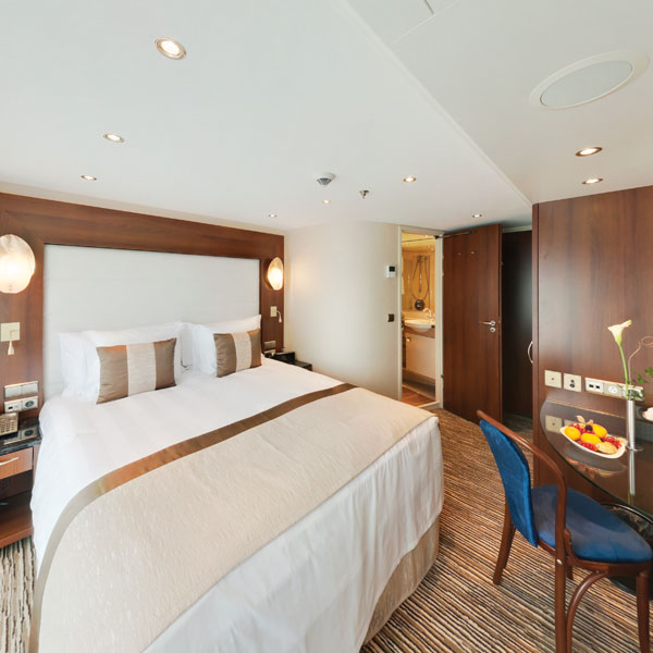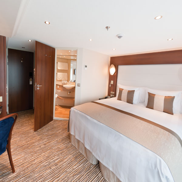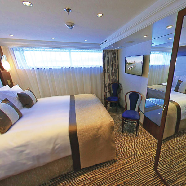 Two 2' by 3' fixed windows, Minibar stocked with complimentary water and soft drinks replenished daily, 32" LED TV, 220v and 110v outlets in cabin and bathroom, Easy under-bed luggage storage, Telephone, safe and individual climate control, Onboard wi-fi available
