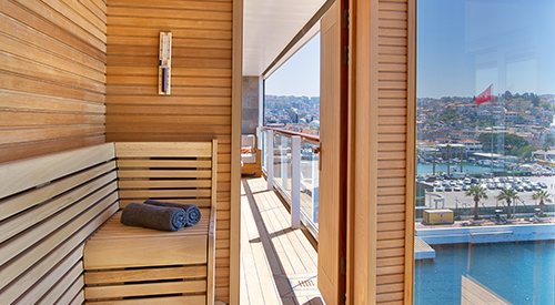 If you like a little more space, our Penthouse Veranda is even larger at 338 sq. ft. and features a generous sitting area. You’ll enjoy even more extras, including a mini bar with alcoholic drinks, soft drinks, water and snacks that is restocked daily, and complimentary shoe shine and pressing service. Your room will be available from 1pm, and you’ll enjoy priority reservations in the main dining room 70 days before departure, as well as two guaranteed reservations in each speciality restaurant, also 70 days before departure.