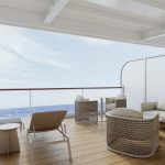 Comprising 6 suites in total, the Skyview Aura Suite (2,024 sq. ft.), Skyview Luna Suite (1,728 sq. ft.), and Skyview Sola Suite(1,325 sq. ft.) will be situated on Decks 14 and 15 and offer a sophisticated, high-end residential feel. An in-suite elevator transports guests to a peaceful terrace deck with shaded areas and jetted tubs that provides stunning views and opportunities for al fresco dining. Creating a luxurious and timeless experience, each Skyview Suite has its own unique layout and character, with design elements that combine classical detailing, a color palette of cool greys with black accents and pops of ruby red, clean lines, plus luxurious materials. The living areas are styled with a refined tone-on-tone décor with jewel-hued accents, while the dining spaces feature custom millwork and sculptural furniture.