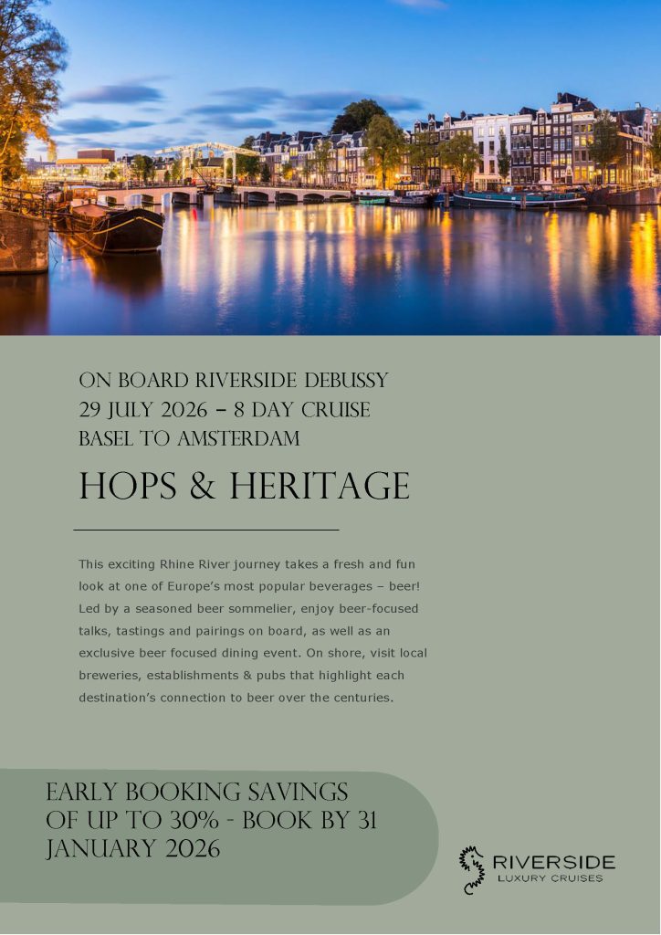 Sail the Rhine River on 29th July 2026 on an 8-day cruise to discover beer making traditions and of course plenty of tastings as ‘Riverside Debussy’ sails from Switzerland to Holland!