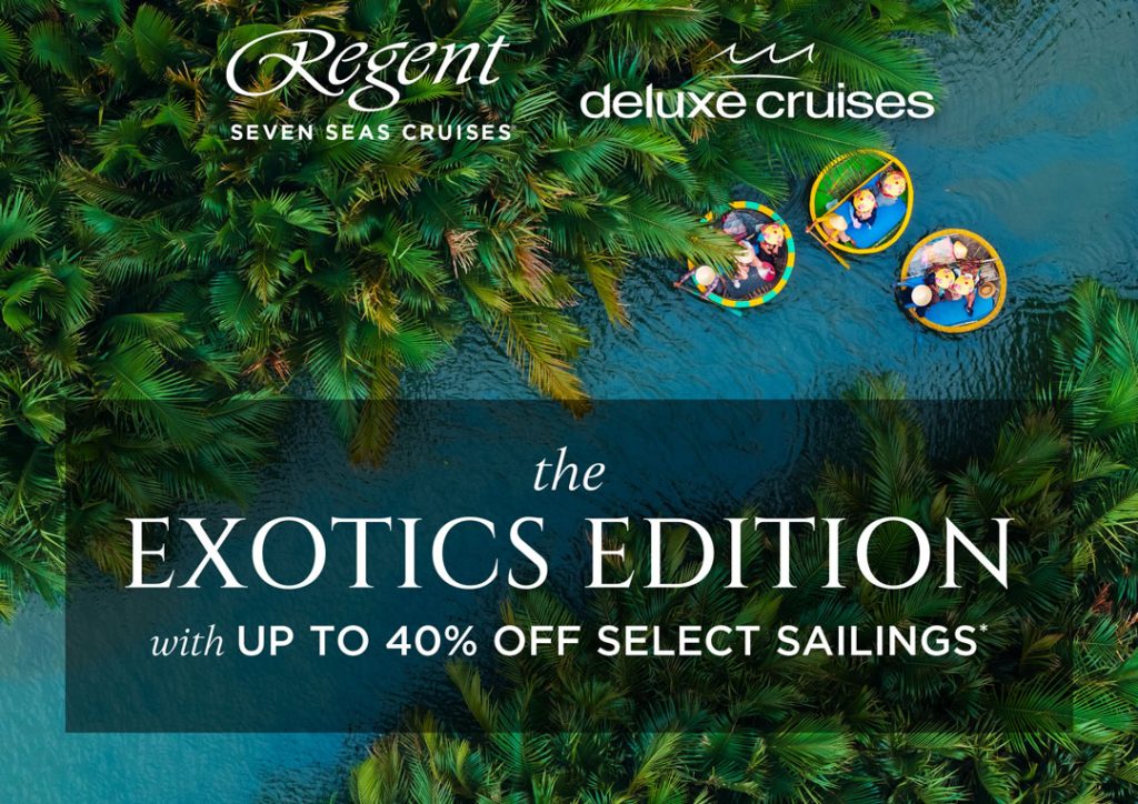 *UP TO 40% OFF: On select sailings, guests will receive up to 40% off the cruise fare. Offer applicable to select suite categories only. Availability is limited and restrictions apply – applicable voyages are subject to removal at any time without notice. For complete Terms & Conditions, including applicable voyages, please visit RSSC.com/Exotics-Edition . Offer may be withdrawn at any time without prior notice. Offer may not be combinable with other promotions, please enquire about combinability at time of booking. Regent Seven Seas Cruises® reserves the right to correct errors or omissions at any time. Full terms and conditions apply, see RSSC.com/legal