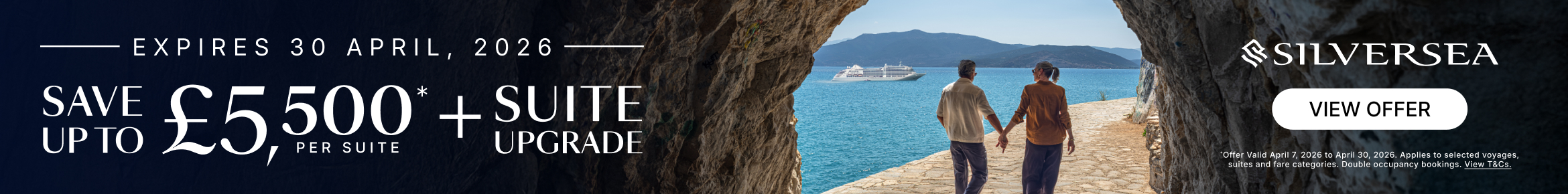 Indulgent Savings Offer and Suite Upgrade Offers are combinable with each other, Event Certificates, National Account Amenities, Referral Savings, Onboard Savings, Combination Savings (back-to-back), Kids Savings and Venetian Society Savings. Offers are not combinable with Last Minute fares. Suite Upgrade Offer is not combinable with promotional group fares. Cancel and re-books do not qualify. Single occupancy guests paying 200% cruise fare are eligible for full offer; single occupancy guests paying less than 200% cruise fare are eligible for a prorated amount of the offer. Changes to the booking may result in the removal of the offer. Prices and offers are capacity controlled, subject to availability, and can be removed at any time without prior notice. Silversea reserves the right to correct any errors, inaccuracies, or omissions and to change or update fares, fees, and surcharges at any time without prior notice. Other restrictions may apply, visit Silversea.com. ©2026 Silversea Cruises LLC. Ships’ registry: Bahamas and Ecuador.