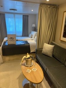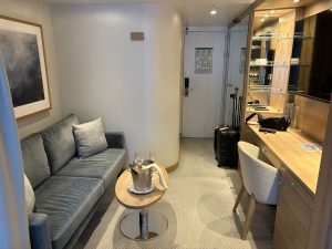 We were accommodated overnight in a Yacht Club Stateroom. These are located on Decks 3 & 4 and average 195 sq.ft./18.12 sq. metres in size. These picture window ocean view staterooms include a marble-lined bathroom with a multi-jet shower and a well-appointed living area with sofa, chair, cocktail table, and built-in dresser with writing desk. Most staterooms offer a choice of 2 twin beds (which ours had) or 1 queen bed. It was both luxurious and, given we were in the heart of Europe’s busiest city, it proved to be very well insulated, keeping out London’s night-time noise which enhanced the experience greatly.