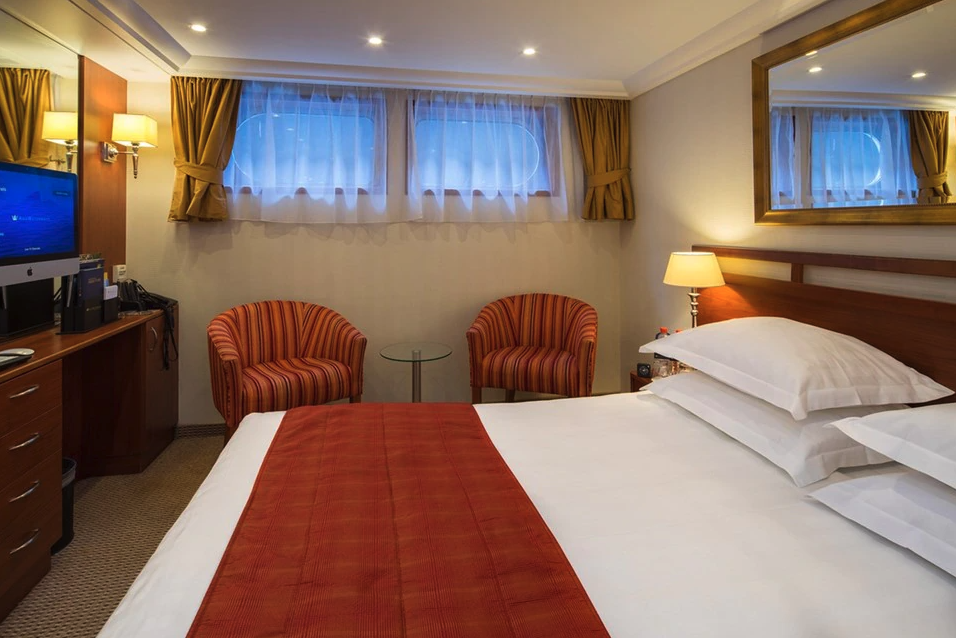 This versatile space hosts a bar, dance floor, plenty of comfortable couches and big windows on three sides and is used for everything from the morning port talks, daytime reading and chatting to scenic cruising, afternoon tea and evening entertainment.
