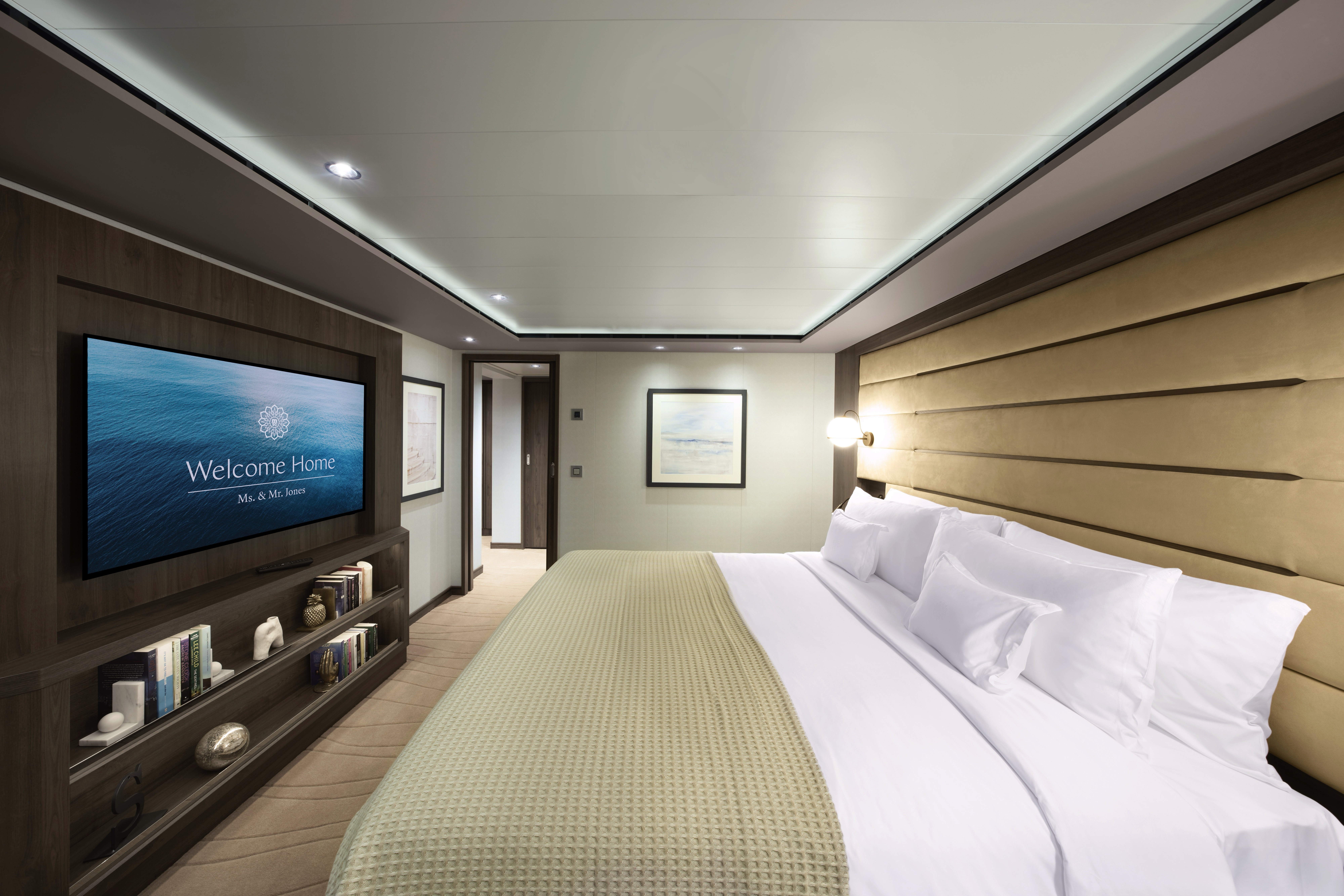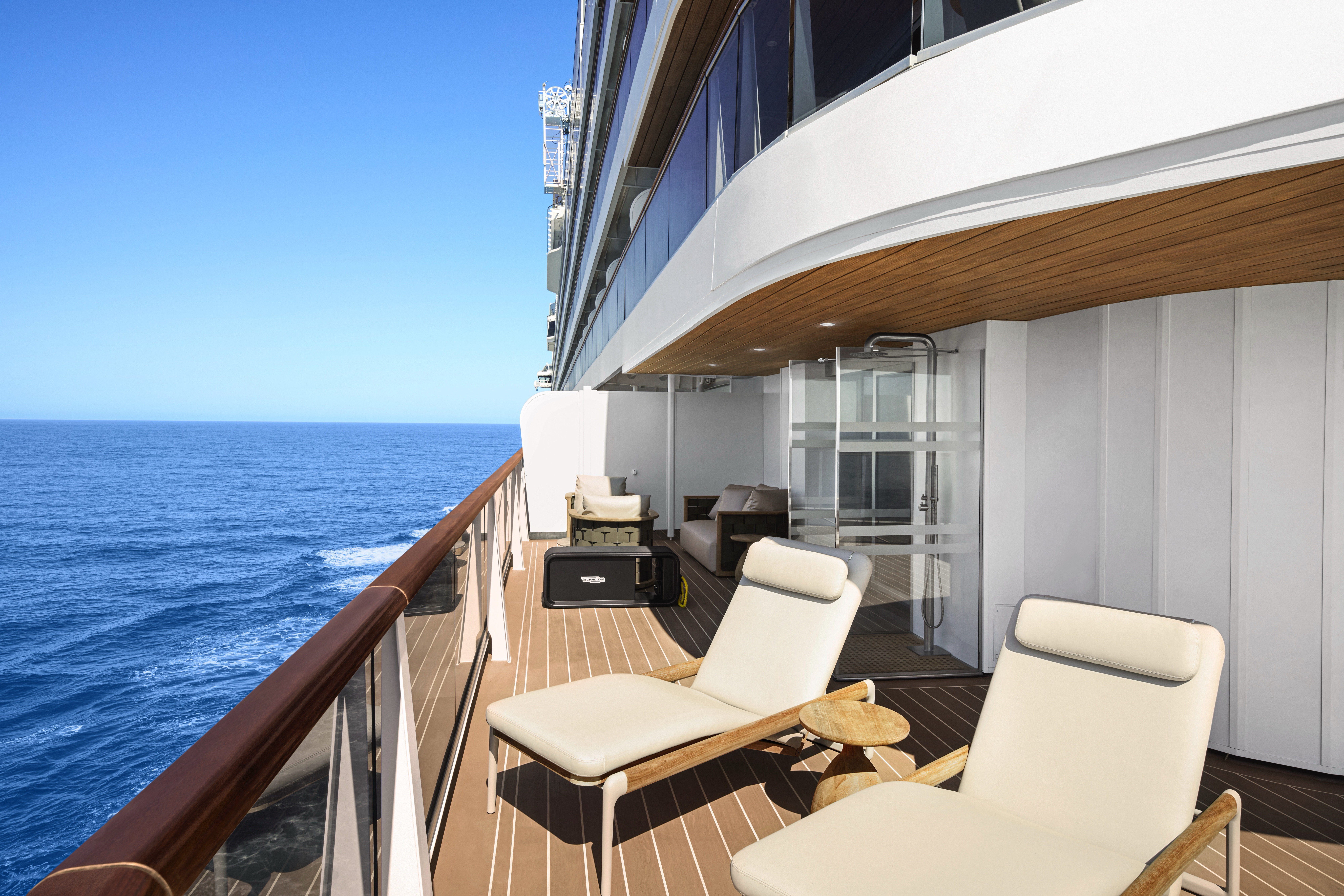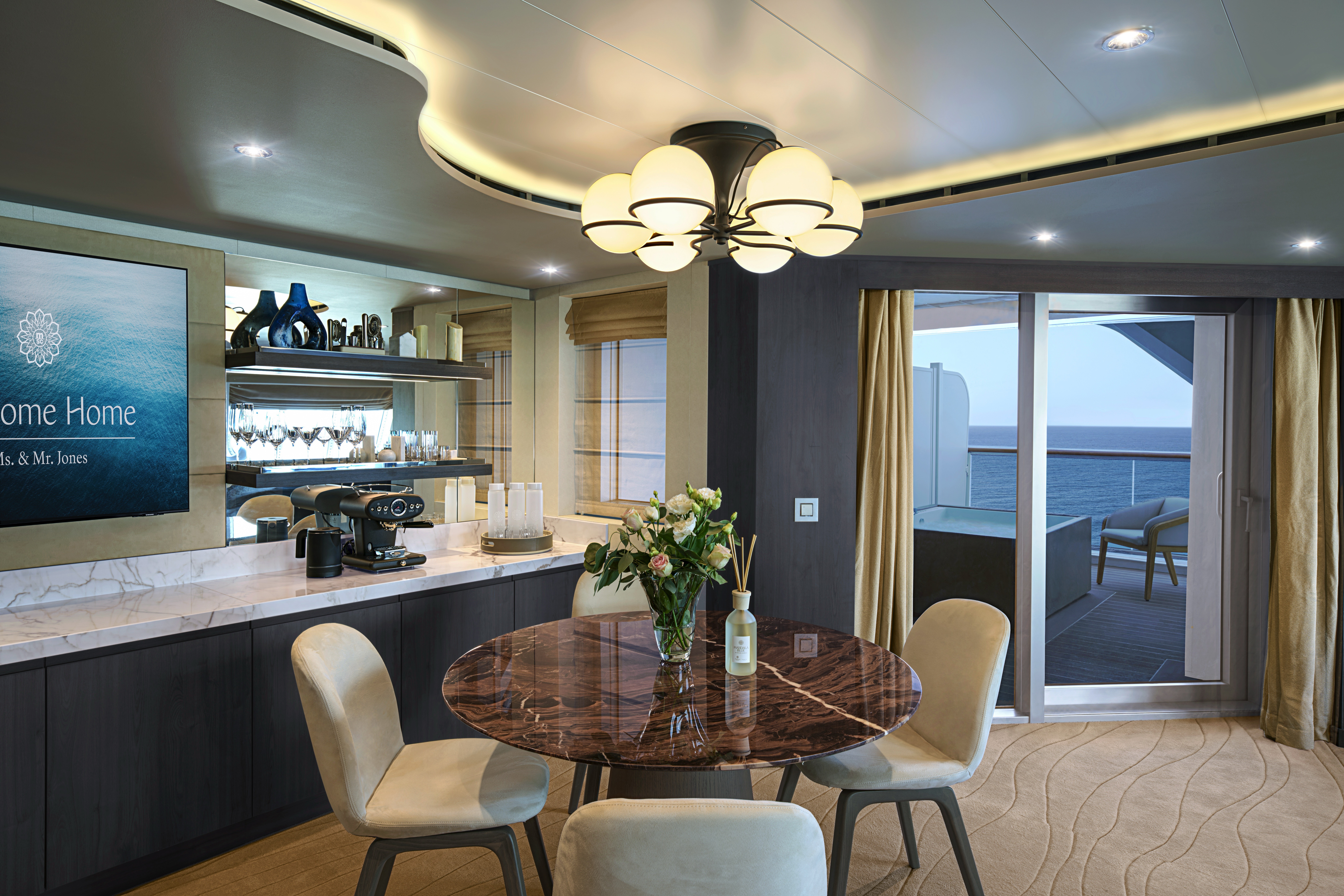 At the heart of the experience are our spacious Homes at Sea. Each of our Ocean Suites, Penthouses, and Residences is a truly serene retreat, featuring floor-to-ceiling windows bathing the space in light, opening onto generous private terraces, complete with daybeds and a dining area, seamlessly blending indoor and outdoor living. Inside, every detail has been considered, including a walk-in wardrobe with seated vanity area, luxurious bathrooms with custom toiletries, fine linens, and the effortless, impeccable service of our Perfect Hosts.