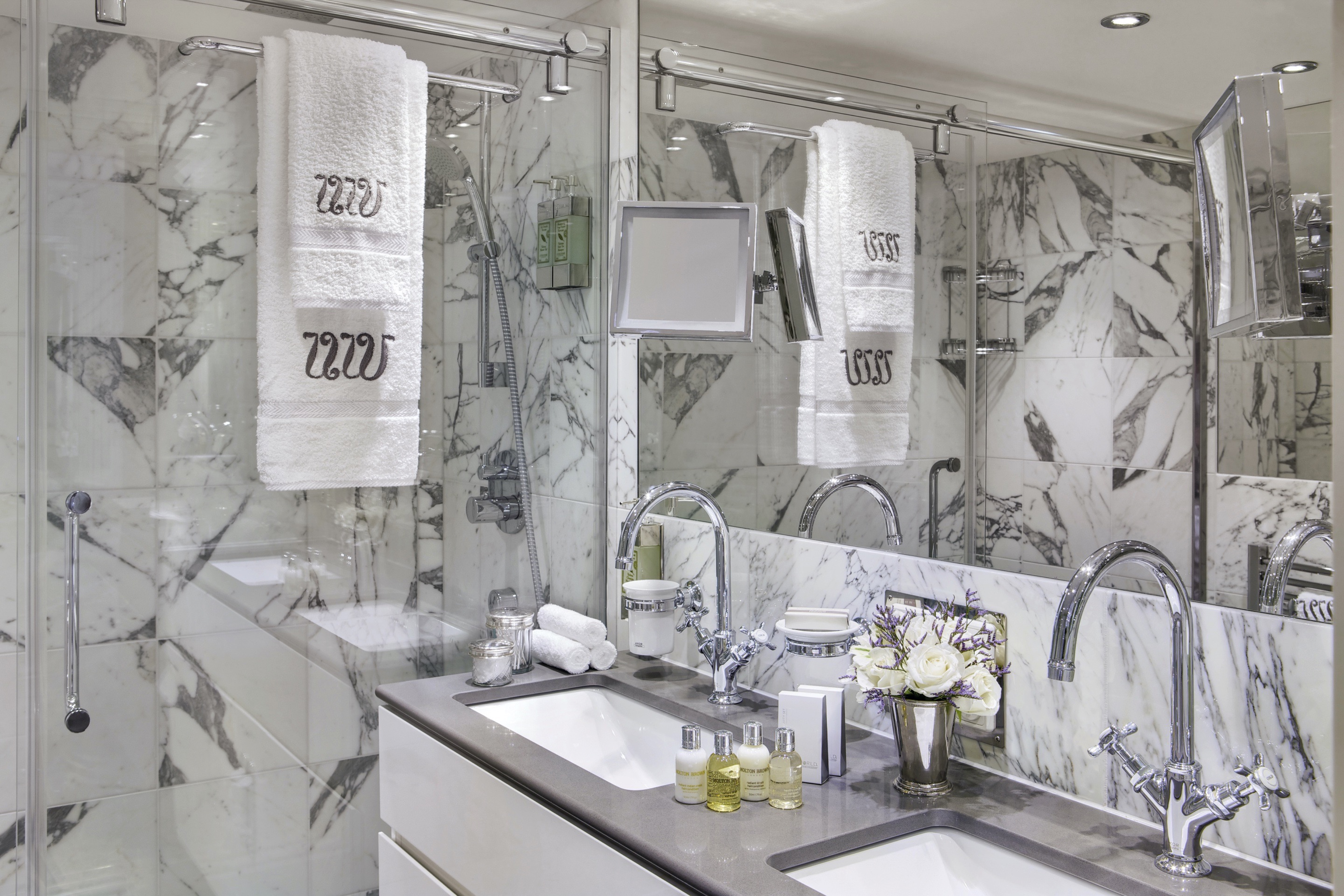- Marble bathroom with Asprey bath and body products, plush towels, heated mirror, backlit magnifying mirror, comfortable bathrobes and slippers