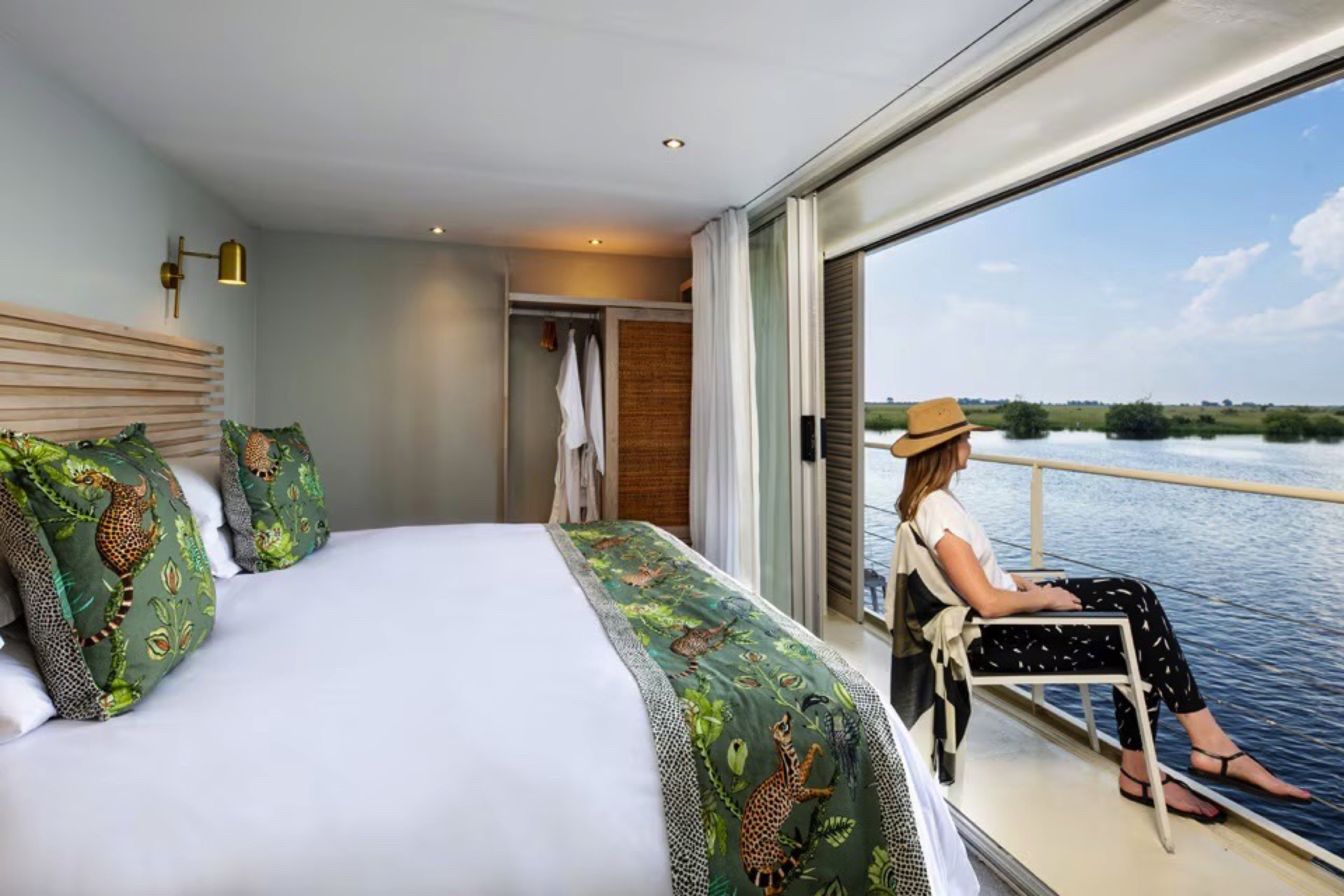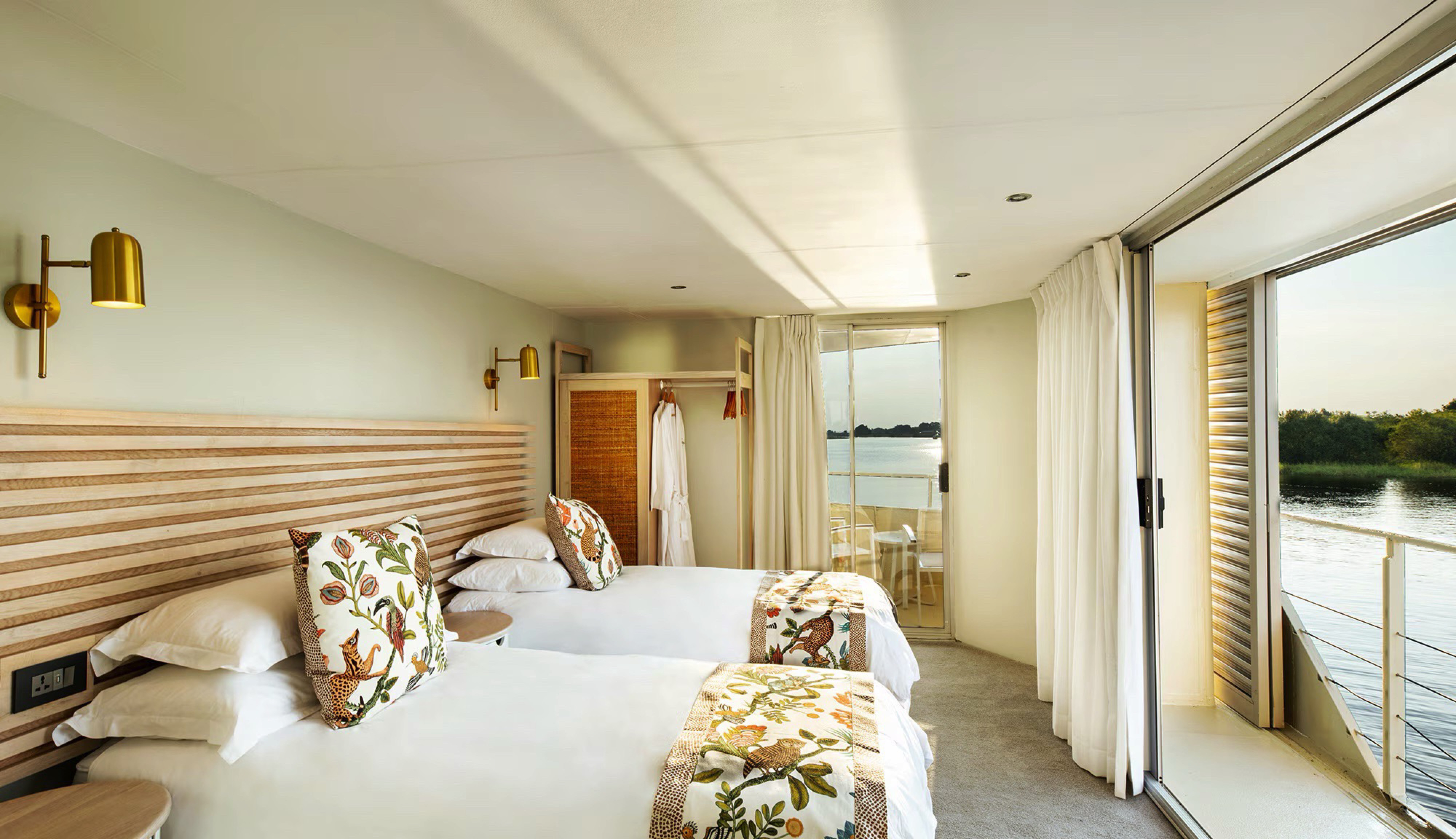 The top deck features an open-air Sun Deck complete with a plunge pool. Unlike a typical river cruise that travels from one port to the next, the Zambezi Queen was designed for an entirely different purpose—to facilitate optimal game viewing along the Chobe.